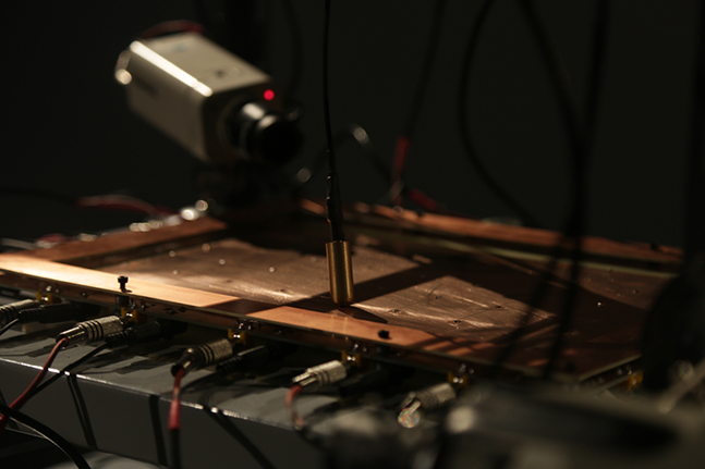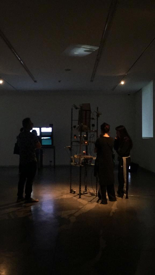 Especificaciones técnicas: veinte cámaras de vigilancia con trípode metálico, sistema mecatrónico aleatorio, proyector CRT de un cañón/ocho monitores CRT de vigilancia de 10", 12" y 14", estantería metálica